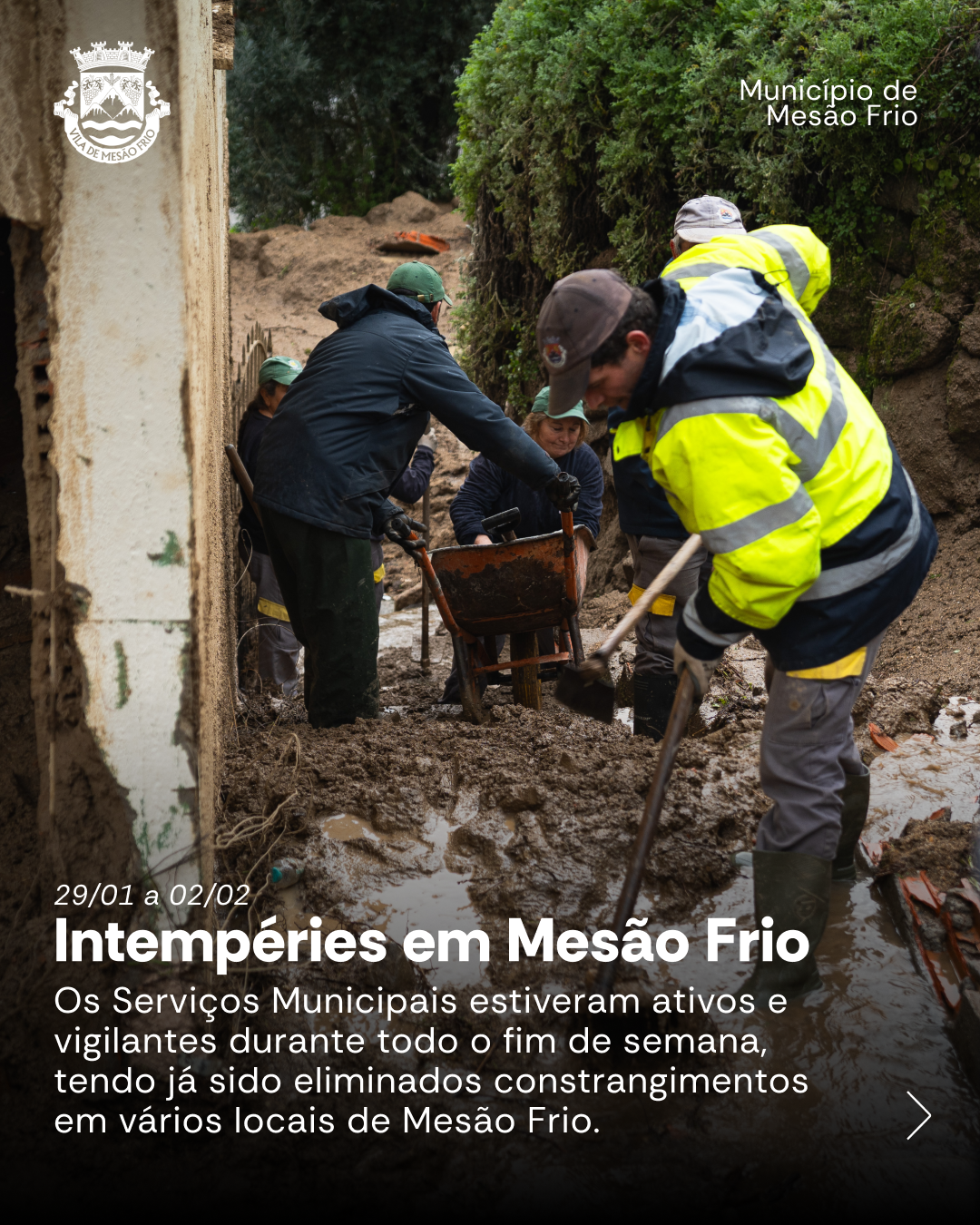 O Serviço Municipal de Proteção Civil, em articulação com os Serviços de Obras e Intervenções da Câmara Municipal de Mesão Frio, manteve-se ativo e em permanente vigilância durante todo o fim de semana, tendo já sido eliminados vários dos constrangimentos verificados, garantindo a reposição das condições mínimas de segurança e circulação.